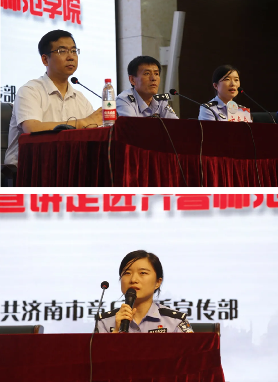 现场,章丘区公安分局反诈中心韩冰,用朴实的语言,真实的案例,向同学们介绍了电信网络诈骗的概念类型以及大学园区常见的几类电诈案件,并给出了“六不”的处理原则。区公安分局网警大队刘静从大的维度向我们分析了当前国内、国际网络安全形势及大学生网络安全现状,提醒学生要加强个人信息安全保护,谨防新型网络犯罪。工商银行章丘支行刘晓松从金融角度讲解个人在银行遇的安全防护措施。