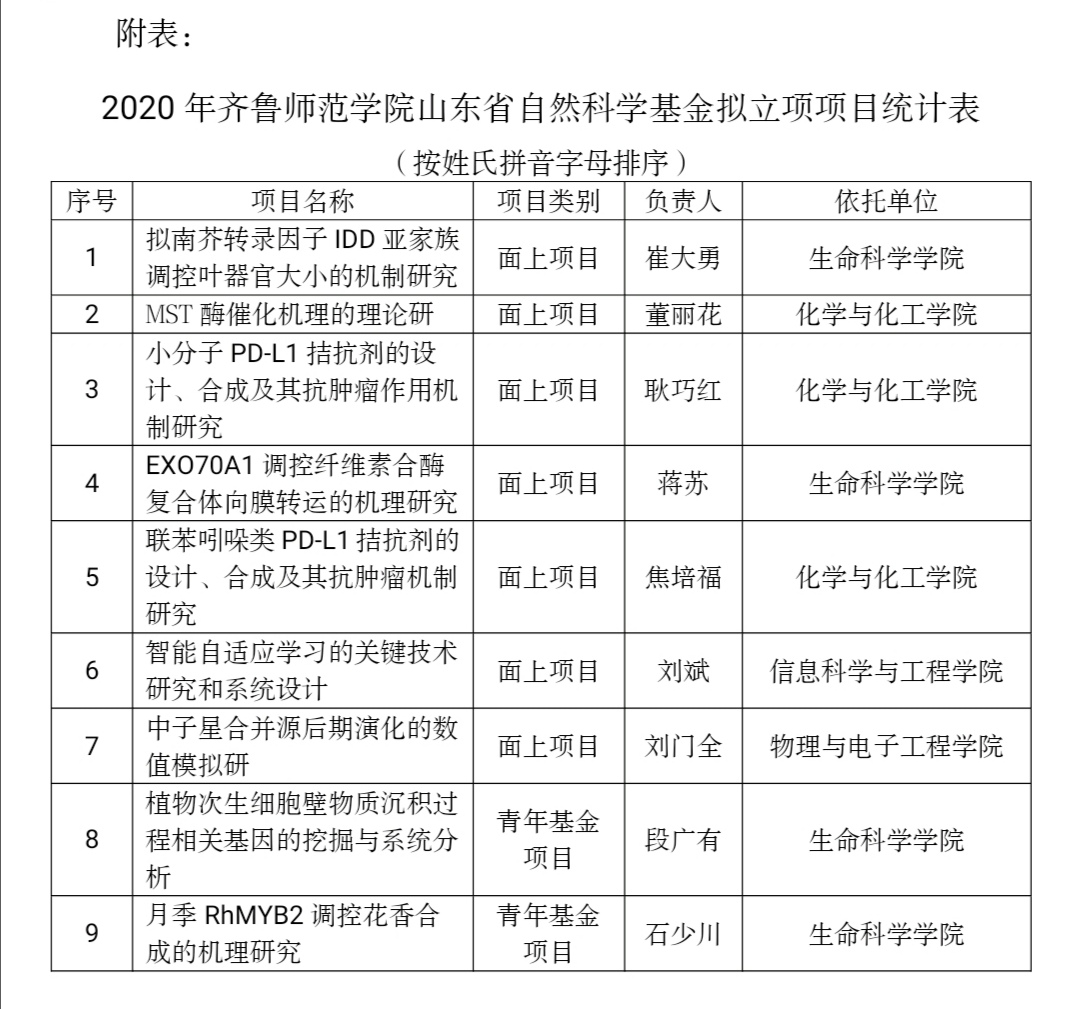 近日,山东省科技厅发布了《关于2020年度山东省自然科学基金(第一批)拟立项项目的公示》。据公示信息显示,2020年度太阳成官网获得9项山东省自然科学基金项目立项,其中面上项目7项,青年基金项目2项。(具体立项名单详见附表)。2020年度,太阳成官网共申报山东省自然科学基金项目(第一批)25项。据统计分析,本年度太阳成官网山东省自然科学基金项目无论是立项数量还是项目资助率均再创新高。