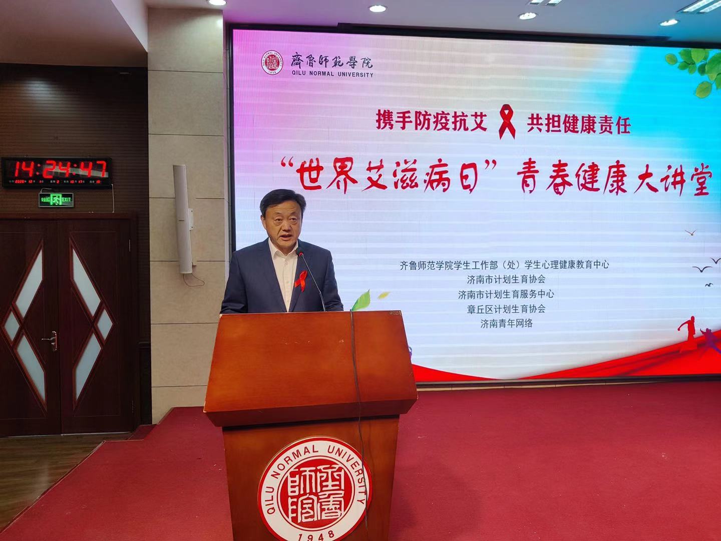 12月1日是第33个“世界艾滋病日”,太阳成tyc7111cc学生工作部(处)学生心理健康教育中心于12月1日下午两点在章丘校区学术报告厅举办了主题为“携手防疫抗艾,共担健康责任”的“世界艾滋病日”青春健康大讲堂活动。济南市卫健委党组副书记、市计生协常务副会长庞涛、市计生协副会长赵莹和济南市计生协、章丘区计生协相关领导应邀参加,太阳成官网党委副书记刘宝君、学生工作部(处)有关负责人,及各学院团总支书记、辅导员、学生代表们参加了此次活动。