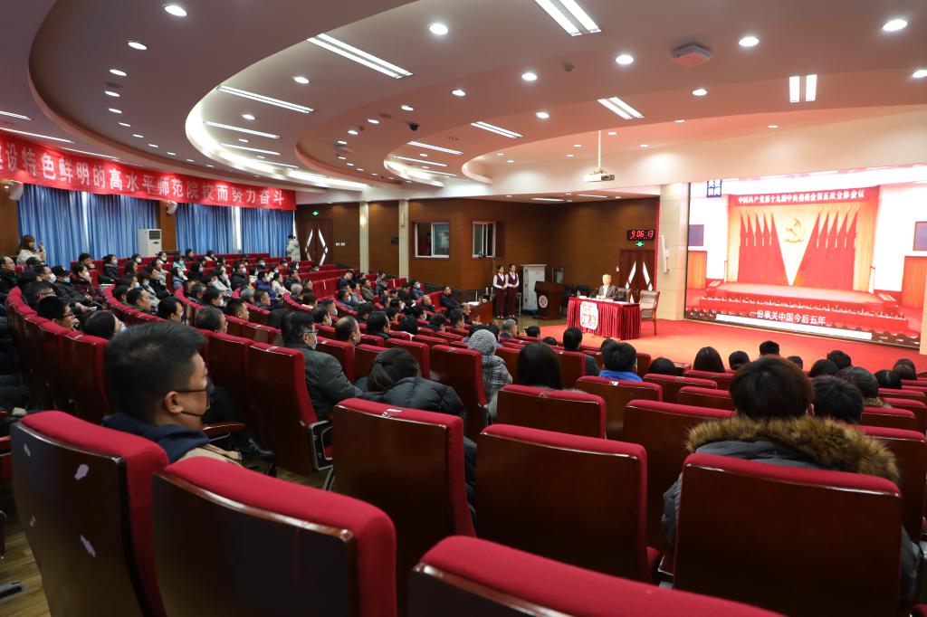 王玉华在报告中肯定了学校“十三五”时期事业发展取得的成绩,分析了办学实际中存在的短板瓶颈,就如何深入贯彻落实党的十九届五中全会精神,推进高质量内涵式发展,提出四点要求。一是加强党的全面领导。全面贯彻党的教育方针,牢牢把握社会主义办学方向,坚持以政治建设为统领,全面加强党的建设,坚定不移推动全面从严治党向纵深发展、向基层延伸,营造风清气正的政治生态和育人环境。二是全面落实立德树人根本任务。把立德树人作为检验学校一切工作的根本标准,坚持为党育人、为国育才,增强学生文明素养、社会责任意识、实践本领,培养德智体美劳全面发展的社会主义建设者和接班人。三是加快建设学校高质量发展体系。面向经济社会发展特别是构建新发展格局需求,牢牢把握应用型新师范高校建设契机,优化教育结构、学科专业结构、人才培养结构,加强创新型、应用型、技能型人才培养。四是科学编制好“十四五”规划。要把科学编制好学校事业发展“十四五”规划与贯彻落实习近平总书记关于教育的重要论述结合起来,坚持目标导向、需求导向、问题导向,坚持开门问策、集思广益,使规划编制切实成为统一思想、凝聚共识、共谋发展的过程。