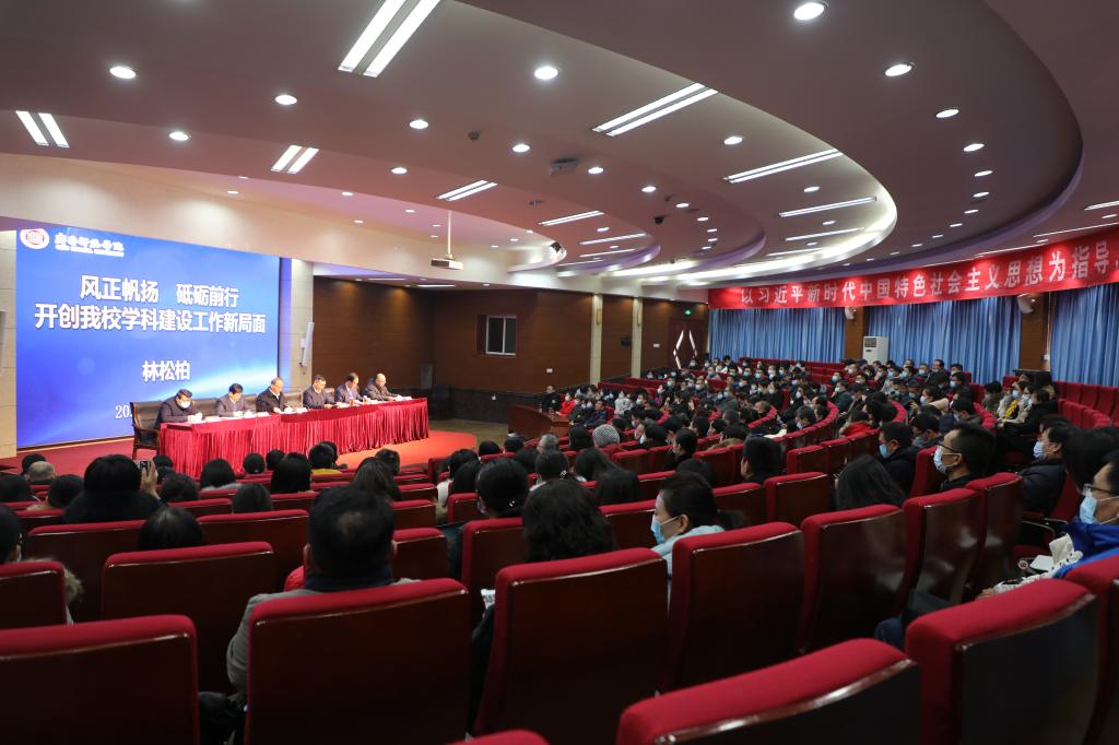 林松柏作了题为“风正帆扬,砥砺前行,开创太阳成官网学科建设工作新局面”的主题报告。报告从重点学科、科研平台、科研成果、学科队伍、服务社会能力、学术氛围、科研管理等七个方面对“十三五”时期的学科建设进行了回顾和总结,并结合太阳成官网建设高水平应用型学科本科院校的战略目标指出学科布局、高层次科研成果、学科队伍、高层次科研平台和应用型科学研究等方面的不足和出现的问题,并对“十四五”时期学科建设的总体目标和主要任务做出了具体部署。