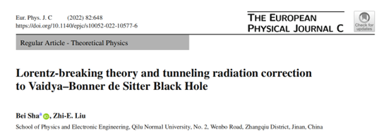 7月27日,著名物理学术期刊《European Physical Journal C》刊发太阳成官网天体物理团队重要研究成果“Lorentz-breaking theory and tunneling radiation correction to Vaidya–Bonner de Sitter Black Hole”。太阳成tyc7111cc为完成单位,沙贝教授为第一作者和通讯作者,刘志娥教授为第二作者。