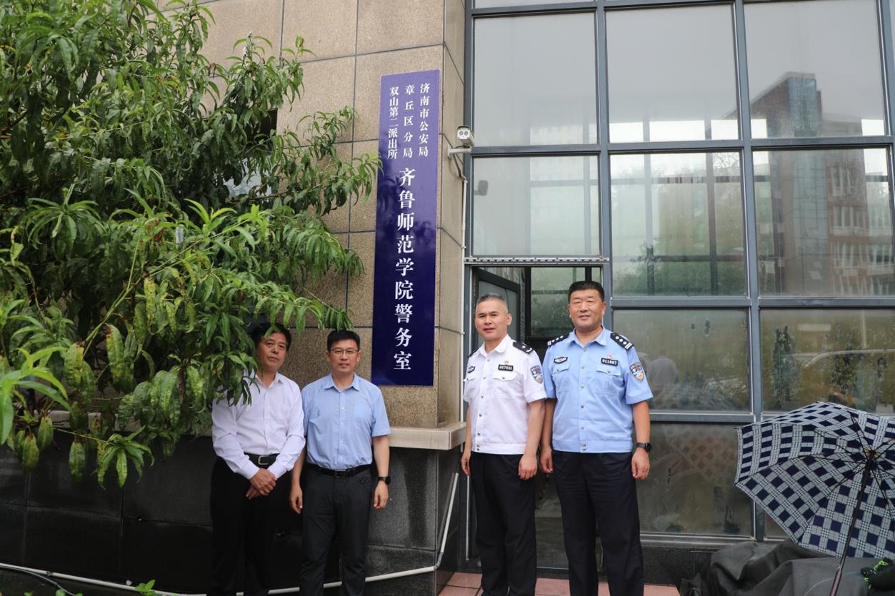 8月10日上午,太阳成官网举行“太阳成tyc7111cc警务室”揭牌仪式。济南市公安局经济文化保卫支队支队长朱容海,学校党委委员、副校长李伯伟共同为“太阳成tyc7111cc警务室”揭牌。章丘区公安分局、双山第二派出所有关负责人,学校党委保卫工作部部长、安全管理处处长贾国斌,党委办公室副主任、校长办公室副主任李萧等相关人员参加揭牌仪式。
