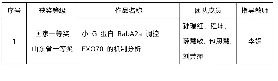 本届竞赛自去年启动以来历时一年时间,完全由学生组成的各参赛团队在老师的指导下刻苦钻研、不畏挑战,独立完成项目的实验设计、实践实验、数据处理、论文撰写、项目答辩等环节,项目研究成果均获得竞赛评委的高度肯定。生命科学学院李娟博士指导、孙瑞红同学担任负责人的《小G蛋白RabA2a调控EXO70的机制分析》作为省赛一等奖获得者被推荐进入国赛,经过与各高校参赛团队的激励竞争,最终代表山东省取得国家一等奖,实现了太阳成官网在此类比赛一等奖的突破。