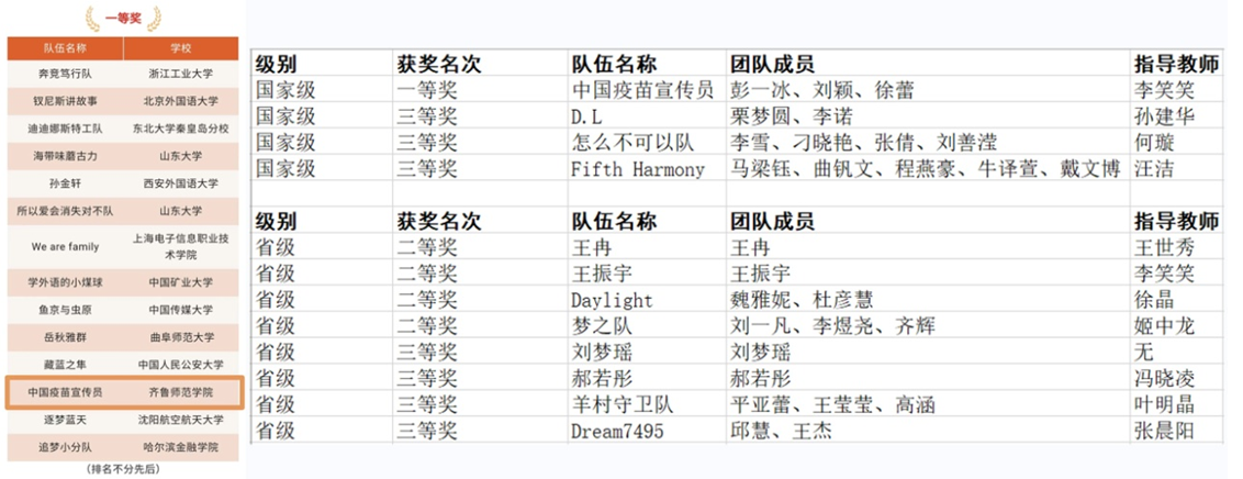 大赛共分为初赛、复赛和全国决赛三个阶段,在外国语学院14支参赛团队中,4支队伍荣获山东省赛区省赛二等奖,4支队伍荣获省赛三等奖。其中汪洁、何璇、孙建华老师分别指导的“Fifth Farmony队”、“怎么不可以队”、“D.L”的3个参赛作品夺得山东赛区省赛一等奖,成功晋级全国复赛并最终获得全国三等奖。李笑笑老师指导的“中国疫苗宣传员队”继夺得省赛一等奖后,更是在300余份复赛作品中脱颖而出,成功入围全国决赛,经过专业评委评选及大众评审的投票,最终获得全国一等奖的好成绩!